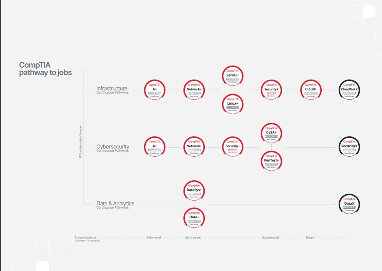 Review the following to determine your ideal certification path. Below you will see a comprehensive roadmap to see what your CompTIA Certification options can lead to for your career