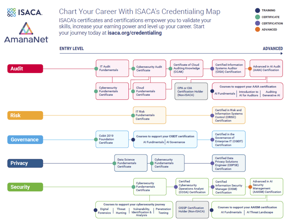 Review the following to determine your ideal certification path. Below you will see a comprehensive roadmap to see what your ISACA Certification options can lead to for your career