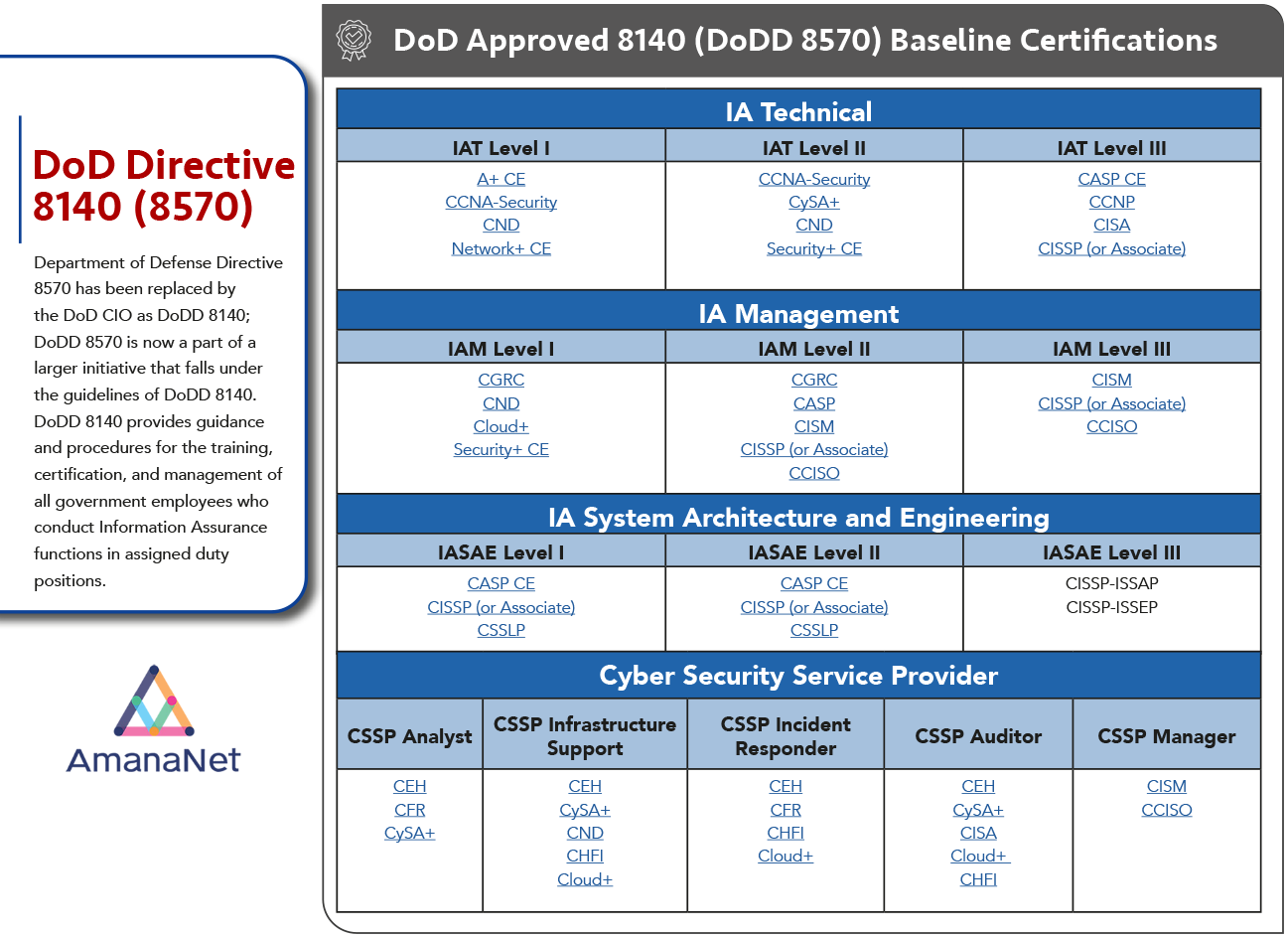 Department of Defense (DoD) Directive 8570 / 8140 requires every full and part-time military service member, defense contractor and civilian employee with privileged access to US Department of Defense information systems (IS) to obtain industry certification credentials. An individual needs to obtain only one of the “approved certifications” for his or her category or specialty and level to meet the minimum requirement