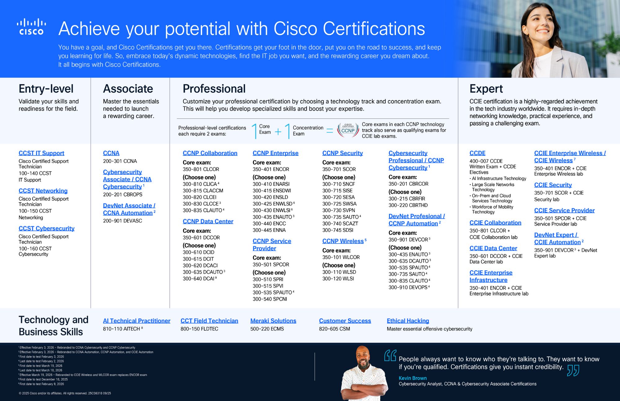 Review the following to determine your ideal certification path. Below you will see a comprehensive roadmap to see what your Cisco Certification options can lead to for your career